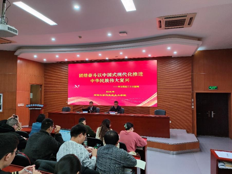 刘兴平书记以“团结奋斗以中国式现代化推进中华民族伟大复兴”为题,从党的二十大报告内容的逻辑框架,党的二十大主题与“三个务必”、“两个行”、“两个结合”、“六个必须坚持”,以中国式现代化全面推进中华民族伟大复兴的新使命和向第二个百年目标进军的新征程等五个方面进行党的二十大精神的解读。同时刘兴平书记用新的伟大奋斗创造新的伟业作为结语,告诉全体师生需要全面学习、全面把握、全面落实党的二十大精神。其中刘兴平书记重点指出学习党的二十大报告精神要领会“六个牢牢把握”:其一,牢牢把握“两个确立”的重大政治意义;其二,牢牢把握过去5年和新时代10年伟大变革的伟大成就;其三,牢牢把握新时代中国特色社会主义思想的世界观和方法论;其四,牢牢把握中国式现代化推进中华民族伟大复兴的使命任务;其五,牢牢把握以伟大自我革命弓|领伟大社会革命的重大要求;其六、牢牢把握团结奋斗的时代要求。