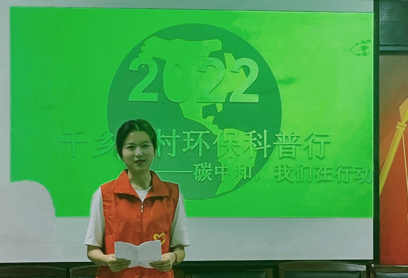 在家乡河南发生暴雨洪灾之时,她带领团队成员参与防汛救灾,主动向相关部门提交生态重建建议书,并被采纳,相关事迹被21家新闻媒体报道,获评2021年江苏省大中专学生志愿者暑期文化科技卫生“三下乡”社会实践活动优秀团队。