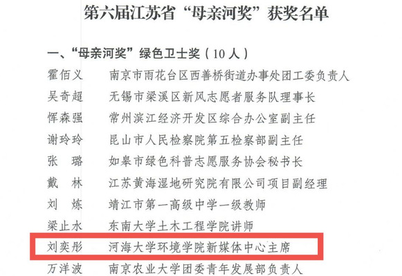 近日,共青团江苏省委对第六届江苏省“母亲河奖”获奖者进行了表彰。我院2020级本科生刘奕彤同学荣获第六届江苏省“母亲河奖”绿色卫士奖。