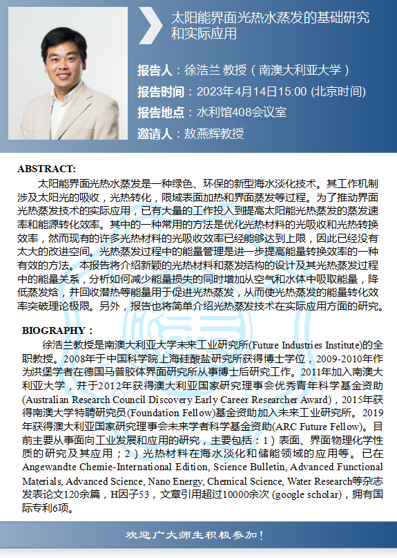 环境学院学术报告:太阳能界面光热水蒸发的基础研究和实际应用