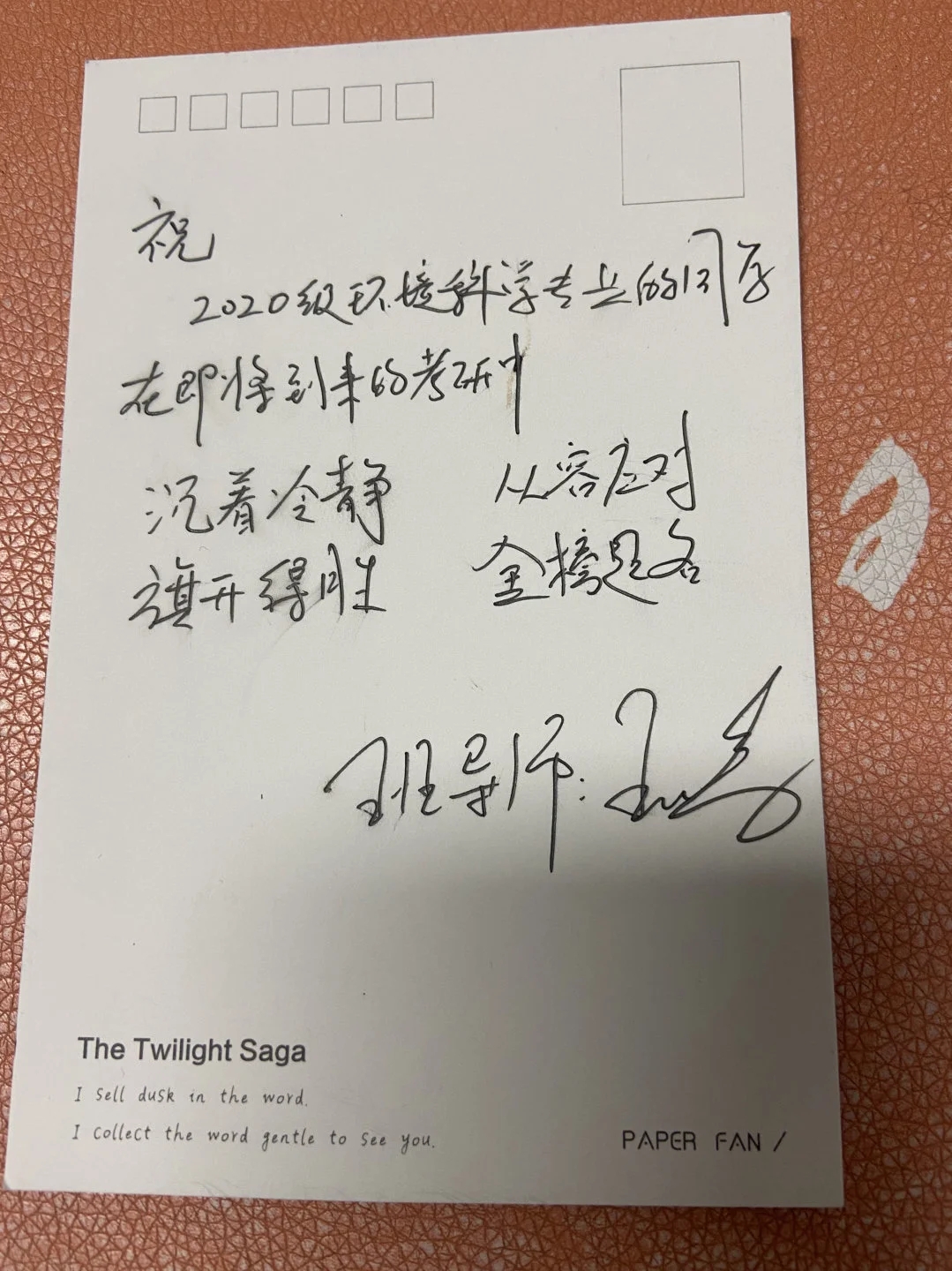 “半师半友半知己,半慕半尊半倾心”,班导师为考研学子送上祝福贺卡,鼓励考研学子稳住心态、奋斗到底、勇夺佳绩。