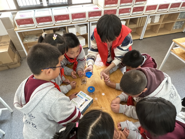 随后,环境学子们带领不同小组进行净水小实验。他们将清澈干净的自来水倒入几个不同的容器中,添加了一些代表生活中常见污染物的粉末,与小同学们一起观察不同容器中的水质变化,引导他们思考如何净化水体。