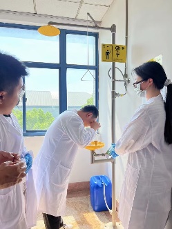 演习环节二:危险化学品泄漏应急演练。模拟了一起浓硫酸泄漏的突发事故。演练现场,一名学生上课时未按实验室安全规范的要求做好个人安全防护,在实验过程中不慎将浓硫酸洒落溅到眼睛和身体上,导致泄漏事故发生。实验老师立即确认现场受伤学生情况,并进行紧急喷淋。同时指挥学生快速有序撤离,封锁实验室防止危害扩散。在学院安全负责人的指挥下,迅速启动应急响应机制。学院应急处置小组迅速抵达并使用专业工具按流程对泄露现场进行清理和恢复,将事件影响控制在最小范围。