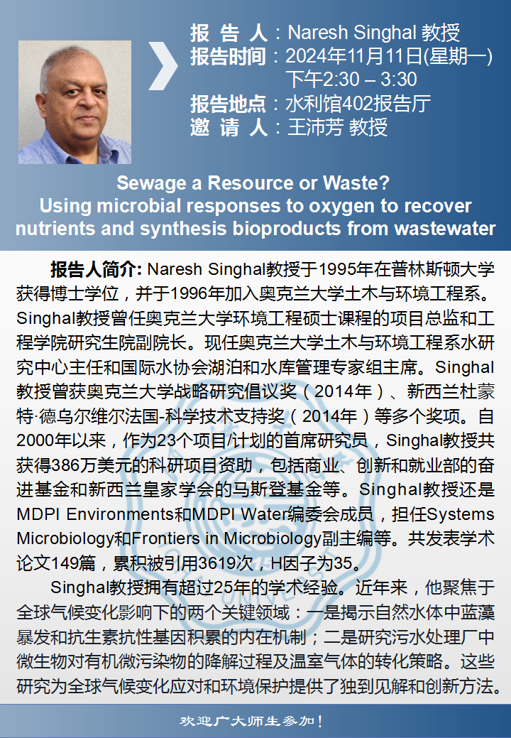 环境学院学术报告:Sewage a Resource or Waste? Using microbial responses to oxygen to recover nutrients and synthesis bioproducts from wastewater