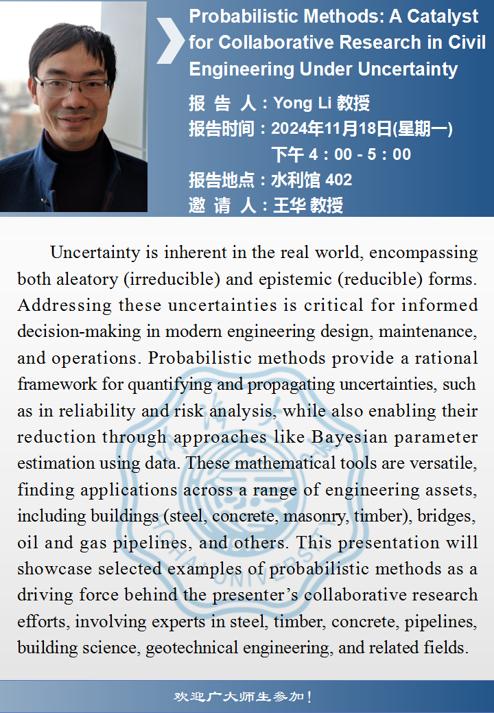 环境学院学术报告:Probabilistic Methods: A Catalyst for Collaborative Research in Civil Engineering Under Uncertainty