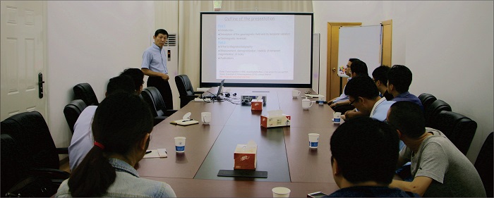 5月19日,同济大学海洋与地球科学学院古地磁实验室主任赵西西教授应邀来访我院交流并作学术报告。上午9点半至11点半,赵教授在海洋学院407学术报告厅做“古地磁学在海洋地质科学中的应用”的学术报告。他深入浅出的介绍了古地磁学的基本原理、采样流程和实验方法等。尤为精彩的是,他举例介绍古地磁学方法在中国南海、日本南海海槽等经典地区的实际运用,探讨了其在地球科学研究中的重要性。作为参加过15次ODP/IODP的航次科学家,他还介绍了美国“决心号”和日本“地球号”大洋钻探船上的专业实验室的功能和相关规则等。他建议我们利用“决心号”六月十一日首次在中国大陆停靠的机会,到上海港具体了解这首功勋卓著的大洋钻探船的相关设备和实验室,为后续大洋钻探提前做好准备。