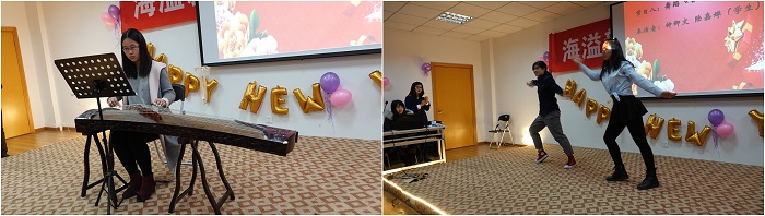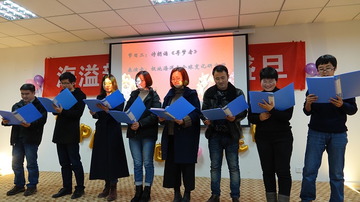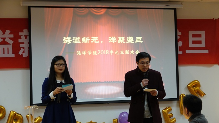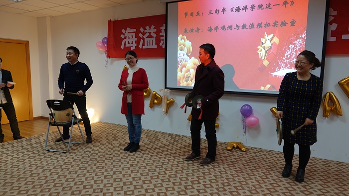 接下来的联欢会中,老师们各展所长,把现场气氛不断推向高潮。海洋观测与数值模拟实验室老师们的一曲合唱《相亲相爱一家人》和三句半《海洋学院这一年》,既让我们感受到温馨的大家庭氛围,还让我们体会了对学院建设的真情洋溢;极地海洋与全球变化研究所的诗朗诵《寻梦者》、院办的诗朗诵《海之子》和海洋地质研究所的合唱《勘探队之歌》,道出了我们追寻海洋梦的澎湃心声;金兴坤、鲍威、王书昆、张帅等四位老师的歌曲串烧,点燃老师们年轻萌动的热火;深远海工程环境研究所曹海锦老师的魔术表演《消失的硬币》《人体引力》《扑克魔术》,带领我们进入神奇的魔术世界;海洋生物研究所的合唱《明天会更好》,更让我们斗志昂扬,带着期许走向明天。学生表演了助兴节目古筝独奏《女儿情》与舞蹈《告白气球》,尽显学生的青春活力和多才多艺。