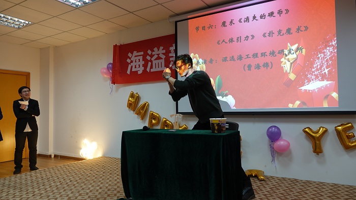 接下来的联欢会中,老师们各展所长,把现场气氛不断推向高潮。海洋观测与数值模拟实验室老师们的一曲合唱《相亲相爱一家人》和三句半《海洋学院这一年》,既让我们感受到温馨的大家庭氛围,还让我们体会了对学院建设的真情洋溢;极地海洋与全球变化研究所的诗朗诵《寻梦者》、院办的诗朗诵《海之子》和海洋地质研究所的合唱《勘探队之歌》,道出了我们追寻海洋梦的澎湃心声;金兴坤、鲍威、王书昆、张帅等四位老师的歌曲串烧,点燃老师们年轻萌动的热火;深远海工程环境研究所曹海锦老师的魔术表演《消失的硬币》《人体引力》《扑克魔术》,带领我们进入神奇的魔术世界;海洋生物研究所的合唱《明天会更好》,更让我们斗志昂扬,带着期许走向明天。学生表演了助兴节目古筝独奏《女儿情》与舞蹈《告白气球》,尽显学生的青春活力和多才多艺。