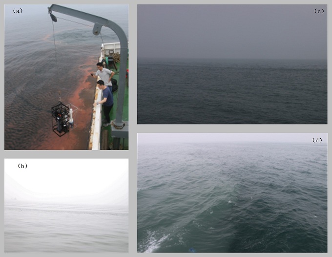 图4 航次中观测到典型海洋现象(a,赤潮;b,内波;c,d,河口锋)