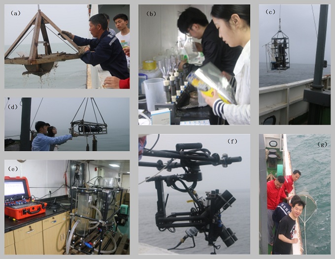 图3 航次采用的设备(a,沉积物采样抓斗;b,水样过滤系统;c,rbr多参数水质仪;d,LISST激光粒度仪;e,走航生物光学测量系统;f,走航海洋表观光谱观测系统;g,生物拖网采样)