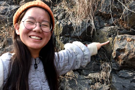 12月16日上午,抵达六合国家地质公园后,讲解老师带队参观由玄武岩构成的石柱林。通过老师的讲解,同学们了解了基性火成岩玄武岩与超基性岩地幔包体橄榄岩的产生原因,岩浆岩的地质分类和种类,学习了与内外动力地质作用有关的知识点,玄武岩“柱状节理”,“杏仁状气孔”的形成过程。除了聆听老师的讲解,同学们还仔细观察了玄武岩的颜色,气孔,节理面等物理特征,在玄武岩节理面上找寻淡绿色的橄榄岩包体,对玄武岩和地幔包体有了更直观的认知。参观完石柱林,同学们跟随带队老师登山远眺远处两座死火山的火山锥形貌,感受大自然强大的创造力。