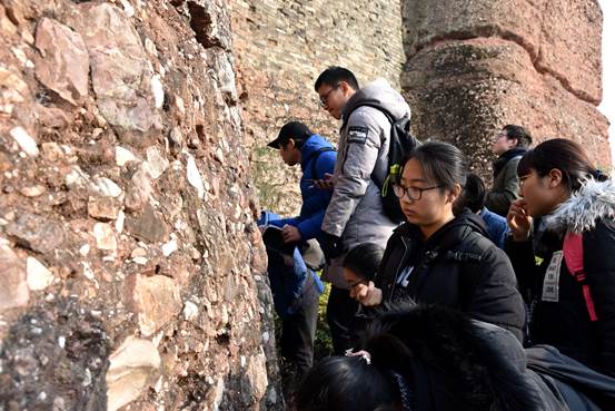 同天下午,大家来到“钟灵毓秀”石头城遗址公园,在各位带队老师的带领下,四组同学重新焕发了精神,一下车就聚精会神地开始倾听老师的专业讲解并积极地开始找寻所提到的地质现象。其中同学们了解到了“洪积砾岩”,也对“断层”的划分有了粗略地认识,以及通过石头叠瓦状的排列来判断水流的方向,还有“水道沉积”,“辫状河道”等内容。同学们对这些专业知识由于有了实物的比照并不觉得枯燥乏味,反而积极地向老师提出了心中的疑惑,而有了专业老师的一对一讲解,更是让同学们在学习上有了更浓厚的兴趣。