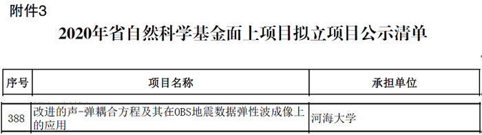 据江苏省科技厅公示,我院喜获4项江苏省自然科学基金项目资助,其中于鹏飞博士主持的“改进的声-弹耦合方程及其在OBS地震数据弹性波成像上的应用”项目获省自然科学基金面上项目资助,姜龙副教授、王腾博士和邵小路博士主持的项目获省青年基金资助。