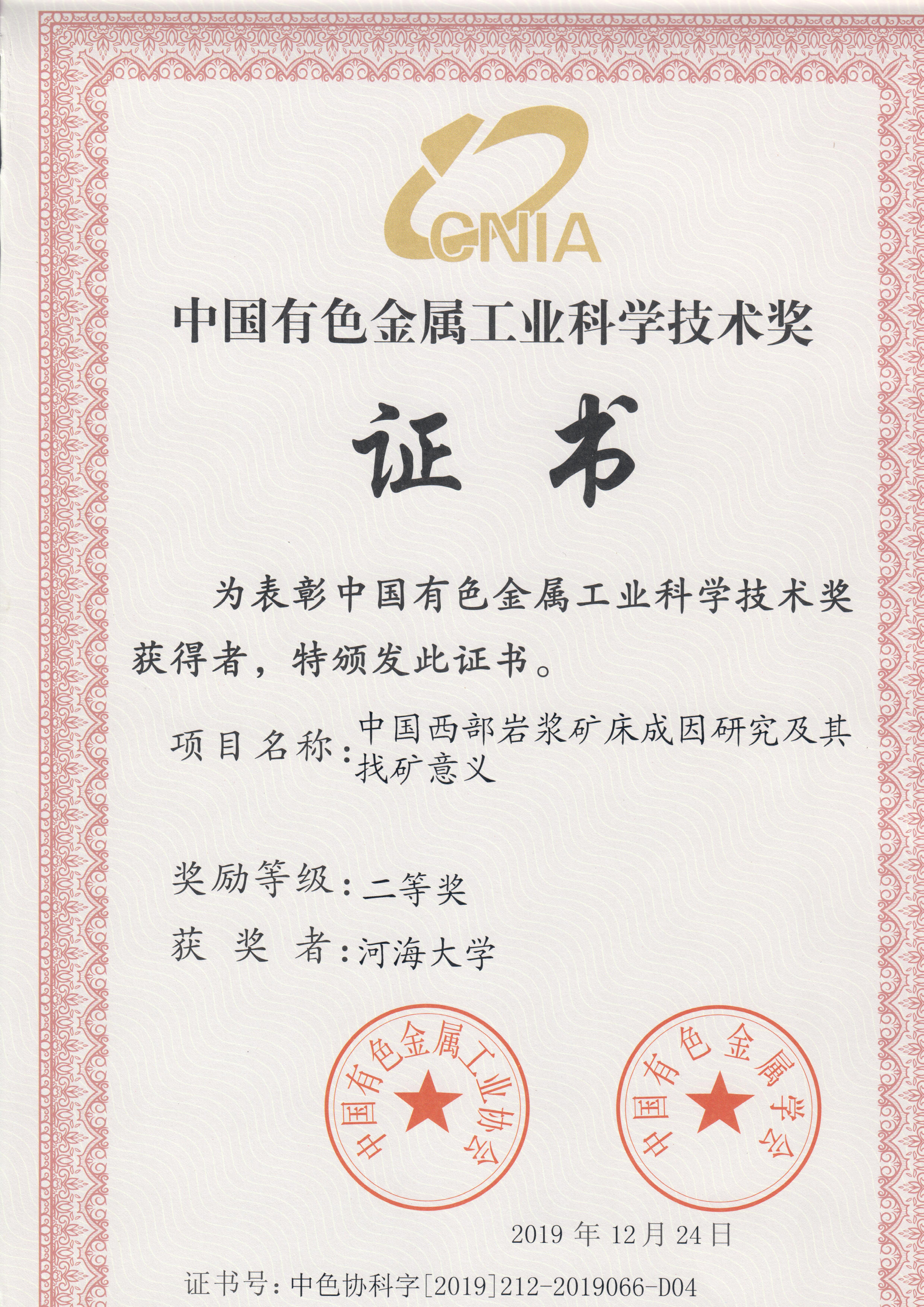 开云电竞网海洋学院颉炜副教授以开云电竞网为第三完成单位参与中国科学院地球化学研究所宋谢炎研究员牵头的《中国西部岩浆矿床成因研究及其找矿意义》项目,在岩浆通道成矿理论和高精度PGE分析方法、中亚造山带铜镍硫化物成矿规律、峨眉山大火成岩省岩浆成矿作用和扬子地块西缘中-新元古代岩浆矿床成矿规律等方面取得了很多重要进展,获得中国有色金属工业科学技术奖二等奖。