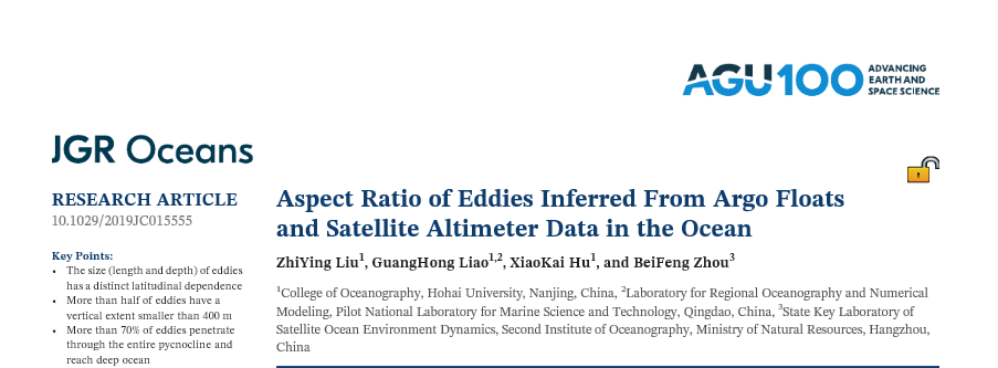 海洋学院物理海洋系2018级硕士研究生刘志颖等在导师廖光洪教授的指导下,采用高度计资料和Argo剖面浮标观测资料,研究分析了准全球海洋涡旋的纵横比以及涡旋的垂直尺度分布的地理特征。