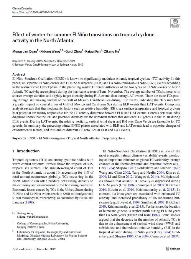 1、Mengyuan Quan, Xidong Wang, Guidi Zhou, Kaigui Fan, Zikang He (2019). Effect of winter-to-summer El Niño transitions on tropical cyclone activity in the North Atlantic. Climate Dynamics, 54(7051):1-16. https://doi.org/10.1007/s00382-019-05081-9.