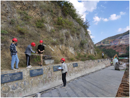 导线法实测地层是本次实习的重点学习内容之一。5人一小组,前、后测手,表格记录员、野外记录员,产状测量员,大家有条不紊进行着各自的分工。从刚开始的一步一试探,前、后侧手永远无法统一的方位角,直到最后总能一口报出对方的坡度角,默契在不断建立。如此长时间高强度的实测工作不仅是一次技能的掌握,更是一次团队协作与心理的历练。未来的路真希望始终有这样的前测手,向前走的每一步,都有你告知我前进的方向。