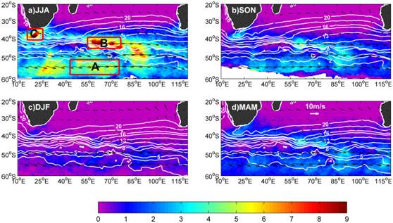 印度洋海气相互作用的研究越来越受到重视。本文利用高分辨率的多源卫星遥感资料和再分析数据,以南印度洋海域(10°E-120°E,60°S-20°S)的中尺度海气相互作用研究为切入点,重点分析了该区域海洋锋面的海面温度(SST)扰动对海面风场的影响,取得了如下创新性结论:
