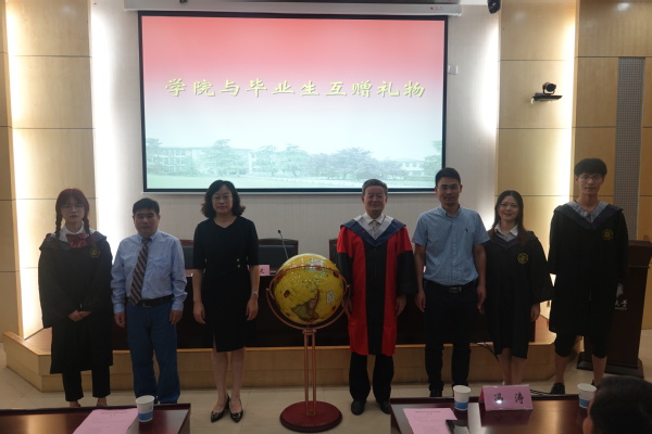 齐义泉院长赠予全体毕业生印有学院名称的戒指纪念品,2021届毕业生回赠学院礼物,并感谢学院的培养。