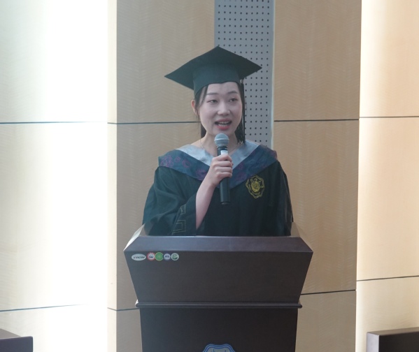 毕业生代表江苏省优秀毕业生杨诗楷同学总结过去四年的成长蜕变,感谢学校学院四年来的培养,并展望未来,祝愿母校在“双一流”建设中,蒸蒸日上,祝愿学院在“海洋强国”建设中勇立潮头。