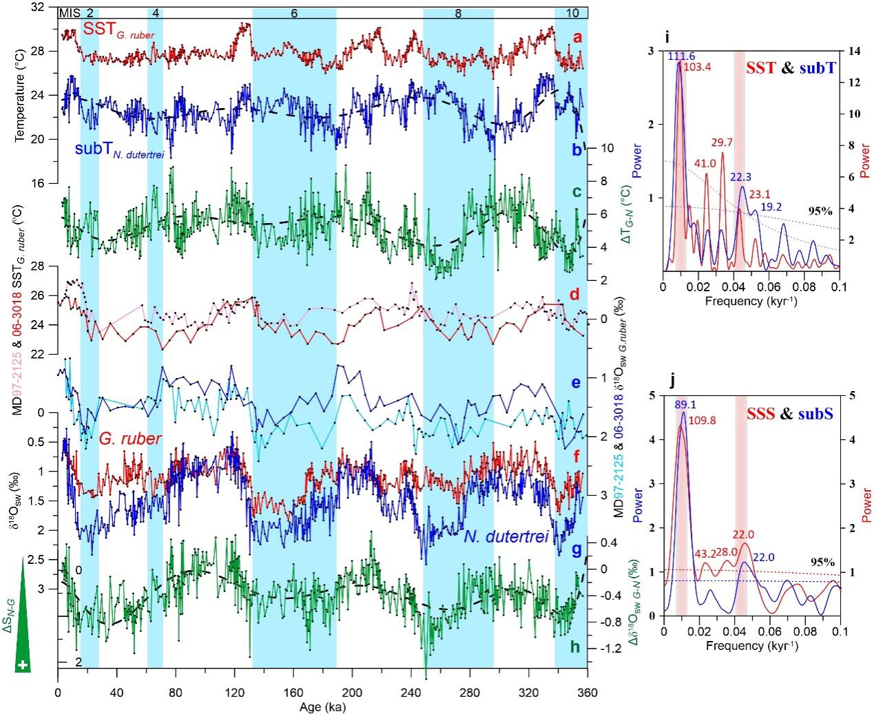 2021年11月22日,我院齐义泉教授课题组博士后张帅与合作者在Nature出版集团的刊物《Communications Earth & Environment》上发表论文,通过测试热带西太平洋暖池核心区海底沉积物中多种有孔虫壳体的地球化学(稳定氧同位素和镁钙比值)变化,在地质时间尺度上,重建了最近三十六万年西太平洋海区的表层和次表层的水体温度与盐度的演化历史,并探讨了太平洋热带与亚热带海区浅层温盐环流在地球轨道岁差频段类ENSO过程中的关键作用。