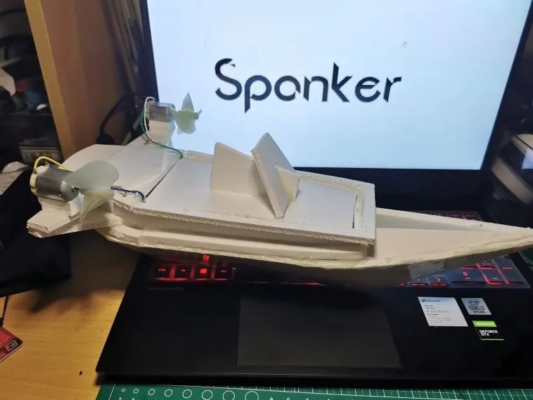 设计理念:船模采用长三角船艏,单体尖底构型,差速转向,整船初步尺寸长36cm,最大宽度10cm,在保证最小迎水面积的同时使差速两片桨叶距离较大,保证差速效率。龙骨构型在保证强度的情况下减轻船体质量,提高船体载荷与机动性。船体为保证径向稳定性,采用前窄后宽的大构型配合稳定鳍,船尾辅以安定面置于桨后,用于航向稳定微调,减小两桨扰动。