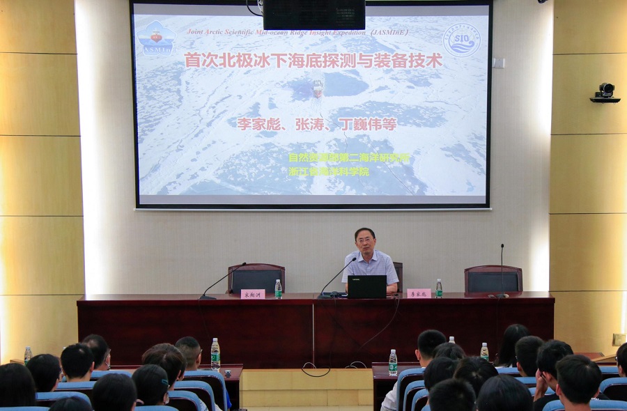 此次访问期间,李家彪院士还在听取了宋翔洲院长关于海洋学院的发展现状和未来规划介绍,参观了我校海洋科学实验中心和校史馆,并且做了“院士讲坛”——“首次北极冰下海底探测:挑战与进展”的学术讲座。李院士介绍了中国科学家在北极冰下海底探测上取得的重大进展,包括国际上首次开展北极加克洋中脊常年冰封区的大规模海底地震和大地电磁探测,以及首次完成加克洋中脊东段的海底热液调查所取得的重要发现,并表示了对于开云电竞网参与极地海底探测的期待。报告结束前,与会师生积极与李院士进行了互动交流,海洋学院等相关学院的200多名师生参加了报告会。
