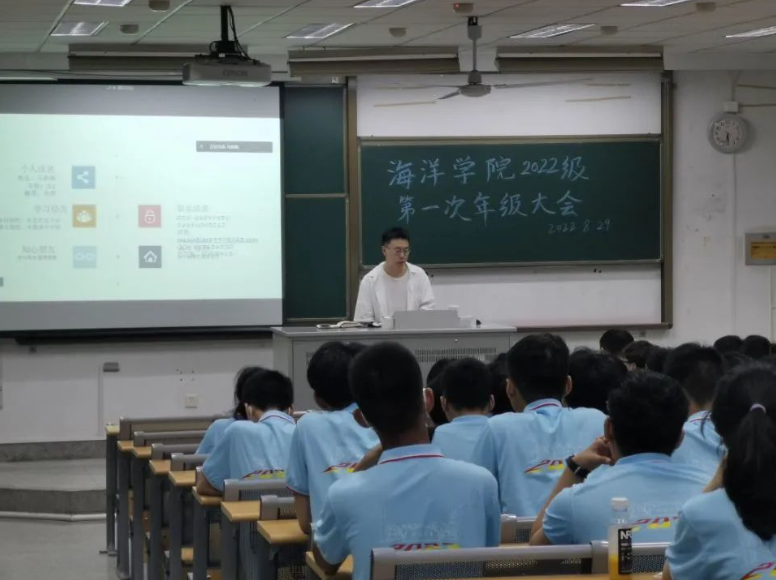 8月29日,22级新生第一次年级大会顺利召开。海洋学院党委副书记吴昊帮助学生分析了在学习、生活以及成长路上会遇到的困难,带领学生开拓思路,寻找方法,为更好适应大学生活,提供了新的方向。22级辅导员马新飙要求学生惜时刻苦,严守底线,希望学生在不断学习成长中,认识自己,挖掘潜能,争取成为一名合格可靠的社会主义现代化建设者。