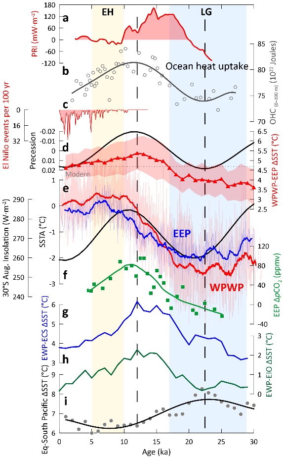 结果显示:1)热带太平洋在末次冰期处于类厄尔尼诺的状态,冰消期时热带太平洋表层水的纬向温差增大,呈现出类拉尼娜的热状态,进入全新世后再次转向类厄尔尼诺态,而该类ENSO状态的转化主要受地球轨道岁差的调控(图二)。2)现代28°C暖池约出现于1.2万年前,对应岁差极小值和类拉尼娜态鼎盛期,其热含量也达到最大值,并在此后,暖池开始显著扩张(图三)。3)西太平洋暖池与东赤道太平洋和西南太平洋位于南大洋翻转环流路径上的次表层水温度在冰消期的升温约开始于2.2万年前,对应于暖池热含量的升高与岁差极大值,而超前于表层海水温度变化,可能源于冰消期浅层翻转环流将南大洋积累的过量热的向赤道输运(图四)。