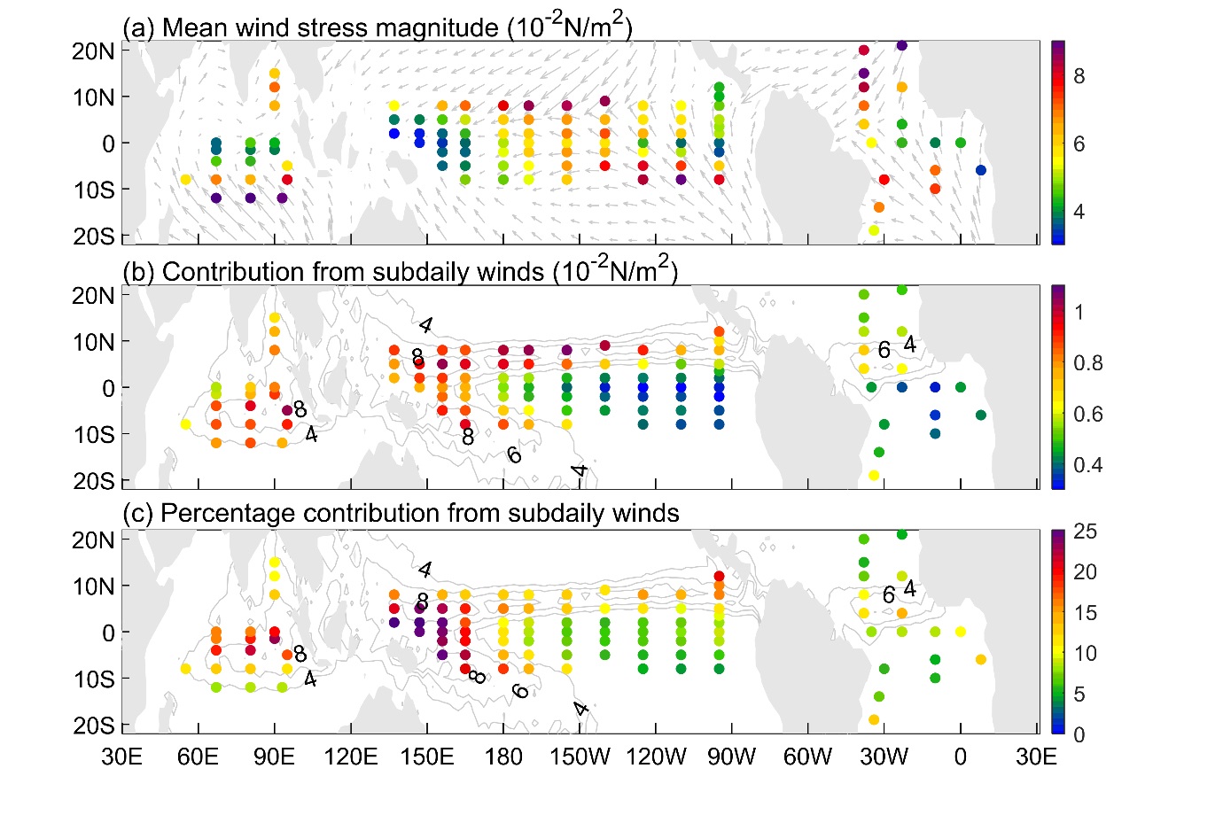 Fig. 1. (a) Mean surface wind stress magnitude estimated from GTMBA observations. (b, c) Contribution from subdaily winds to the mean wind stress magnitude and the corresponding percentage. Gray arrows and contours denote the satellite-derived mean surface wind stress (a) and precipitation rate (mm/day, b, c), respectively. The satellite-derived mean wind stress was calculated from the Scatterometer Climatology of Ocean Winds (SCOW, Risien and Chelton, 2008).