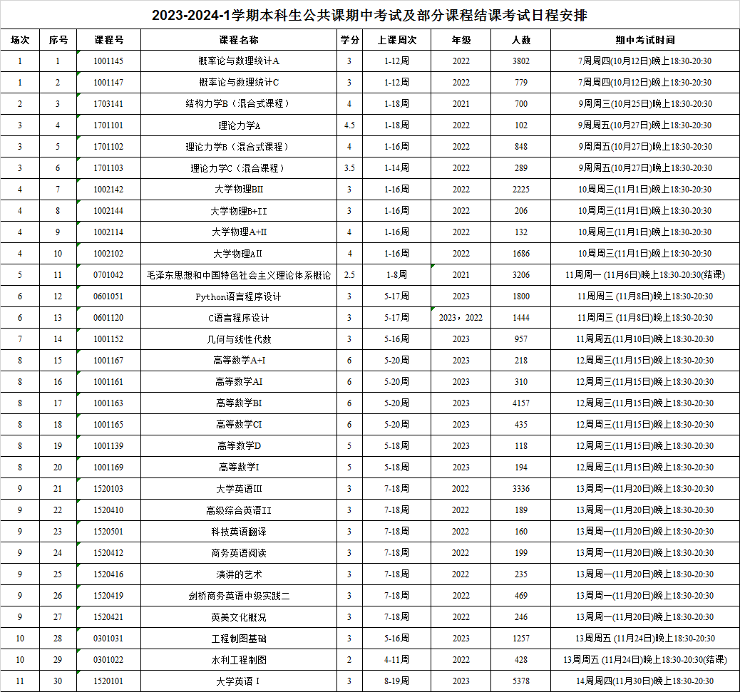 2023-2024-1学期本科生公共课期中考试及部分课程结课考试日程安排