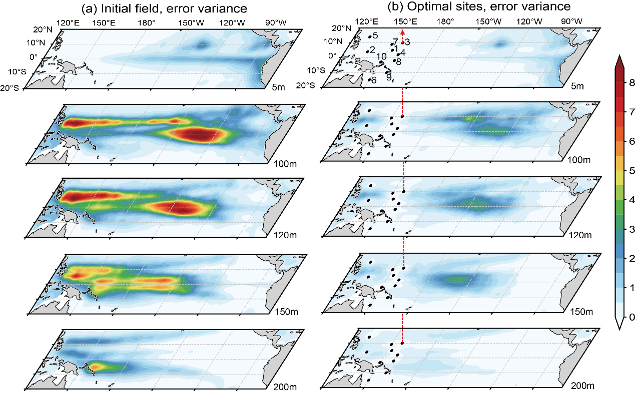 图1. 海温的预报误差方差估计:(a)无新增锚系浮标;(b)有新增浮标及浮标。图b中数字表明的新增锚系浮标的最优观测位置