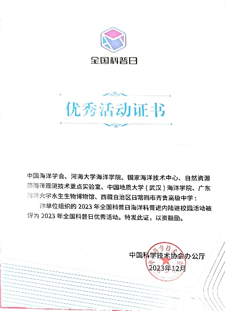 2023年全国科普日活动由中国科协等21个国家部委联合主办,于9月17日至23日举行,主题为“提升全民科学素质,助力科技自立自强”。我院与中国海洋学会、国家海洋技术中心、自然资源部海洋观测技术重点实验室、中国地质大学(武汉)海洋学院、广东海洋大学水生生物博物馆、西藏自治区日喀则市齐鲁高级中学等单位联合组织申报的“海洋科普进内陆进校园”活动被评为 2023 年全国科普日优秀活动。