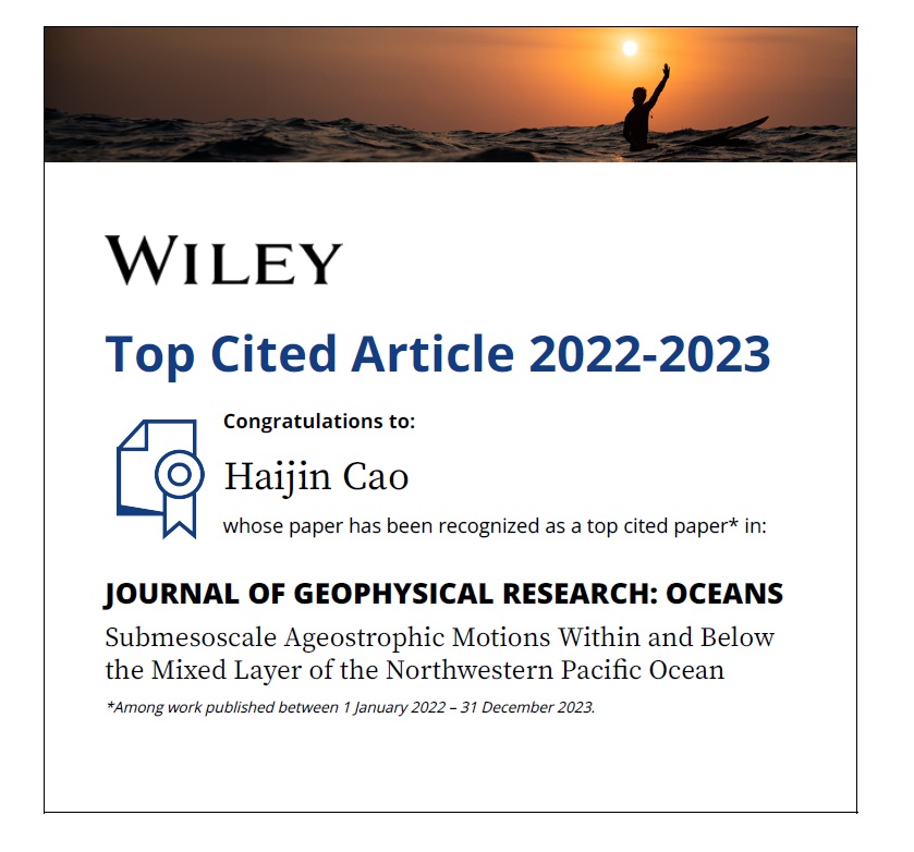 近日,我院曹海锦副教授获评Journal of Geophysical Research-Oceans 2022-2023年度高被引学者(one of the top 10 most cited papers between 2022.01-2023.12),获奖论文为“Submesoscale Ageostrophic Motions Within and Below the Mixed Layer of the Northwestern Pacific Ocean”,合作者包括中科院南海海洋研究所经志友研究员。