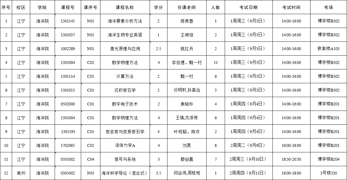 2025-2026-1学期海洋院专业课开学补考安排