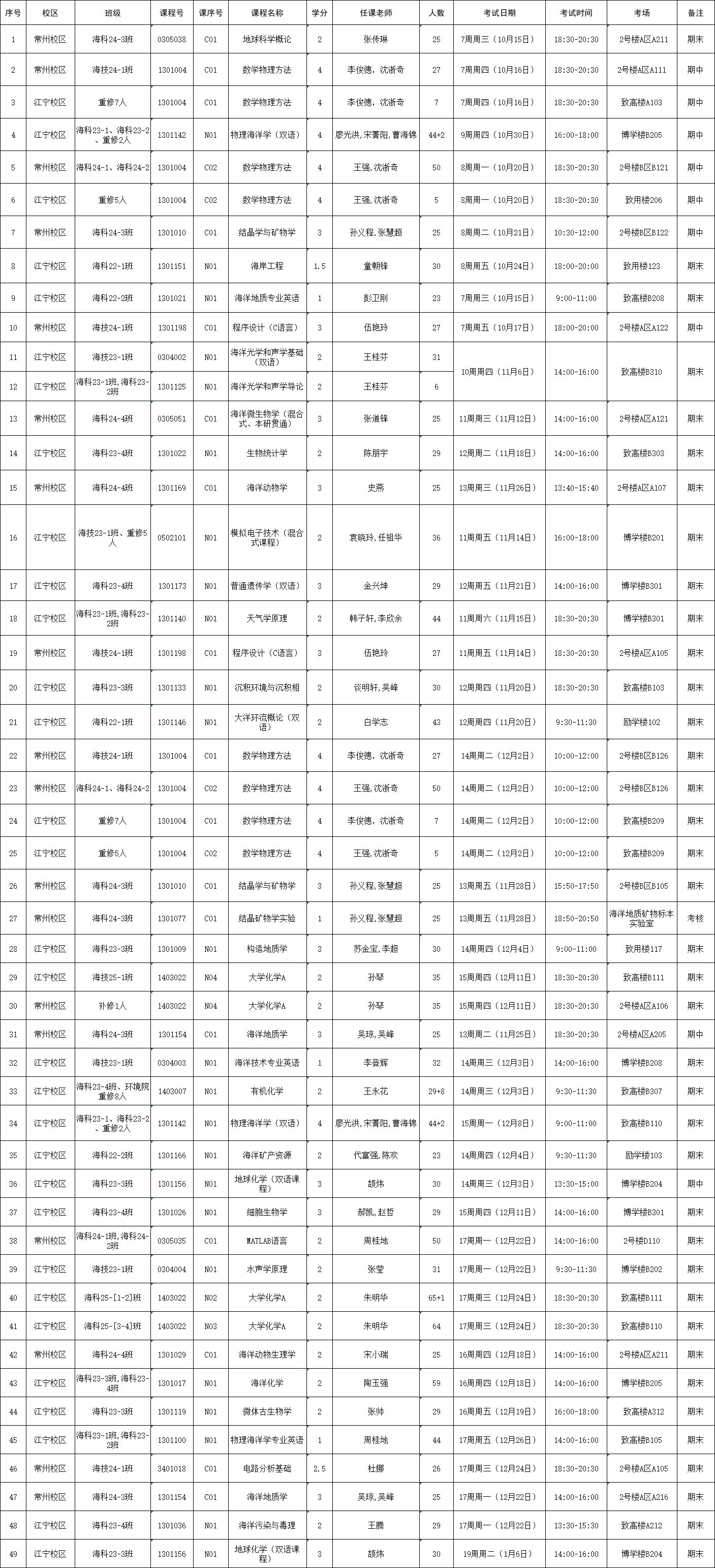 2025-2026-1学期海洋院专业课考试安排