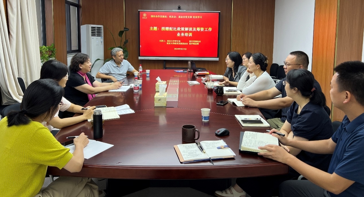 南京大学审计处张竹青副处长和南京大学教育发展基金会张宇峰老师受邀为支部党员开展了捐赠配比政策解读及筹资工作业务培训。两位主讲人围绕捐赠配比政策解读、如何谋划校庆筹款工作、如何做好大额筹款、筹资与发展等方面的问题展开了详细的讲解。