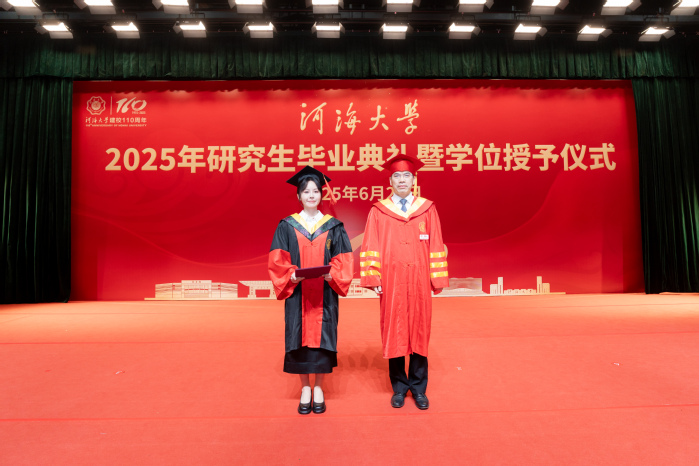 毕业生代表、电气与动力工程学院博士普月表达了对母校、领导和老师的崇高敬意和衷心感激之情,表示将承河海前人之志,心怀热忱、脚踏实地,以不惧挑战的勇气、持之以恒的毅力,在广阔天地中书写属于自己的时代答卷。
