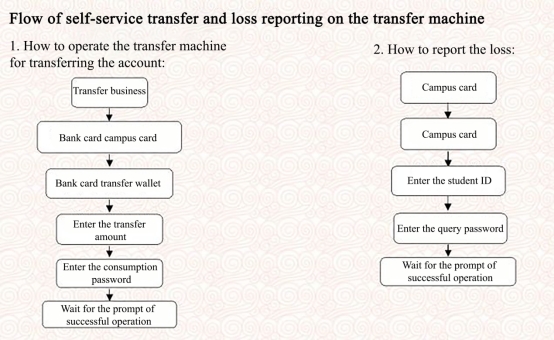 All campuses are equipped with transfer machines. The main functions are: online payment, bank card-campus card transfer (China Construction Bank for Changzhou and Bank of China for Nanjing), campus card balance inquiry, campus card loss report, unlock, change of query password, modification of consumption password, modification of consumption limit, intelligent electronic control recharge, query, etc.