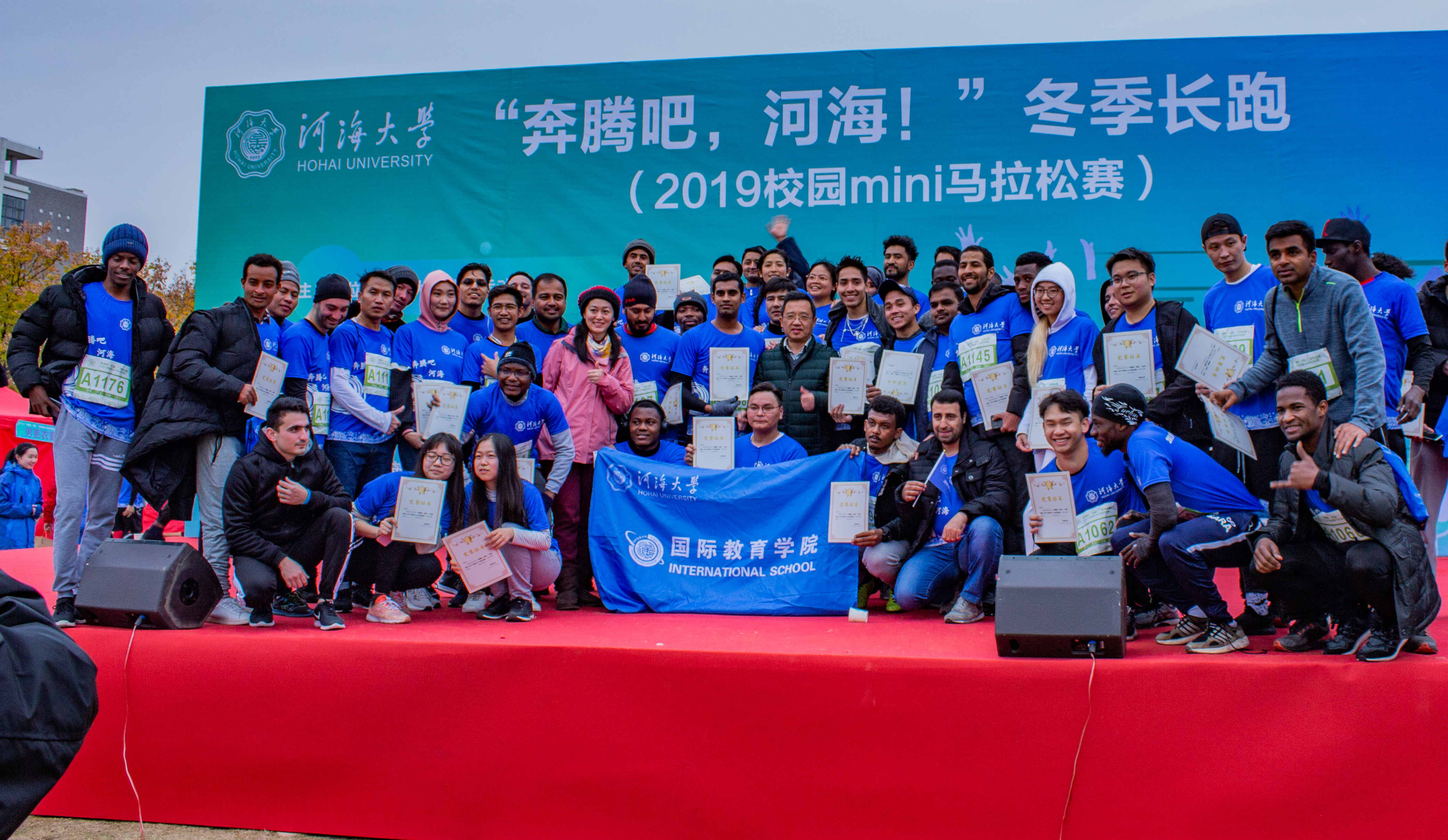 At beginning, Mr. Guo Jichao, Deputy Party Secretary of CPC of Hohai University gave an opening speech. After that, students enjoyed extraordinary stage performances (singing, dance, gymnastics etc.). Although the weather was cold, nearly 2000 competitors attended the Marathon, included staffs and students, among them more than 100 International students from 37 countries also joined the race. It started at 9:00 am. Although it was not a track race, the 6 Kilometers' journey saw a fierce competition among the participants, albeit it was thrilling.