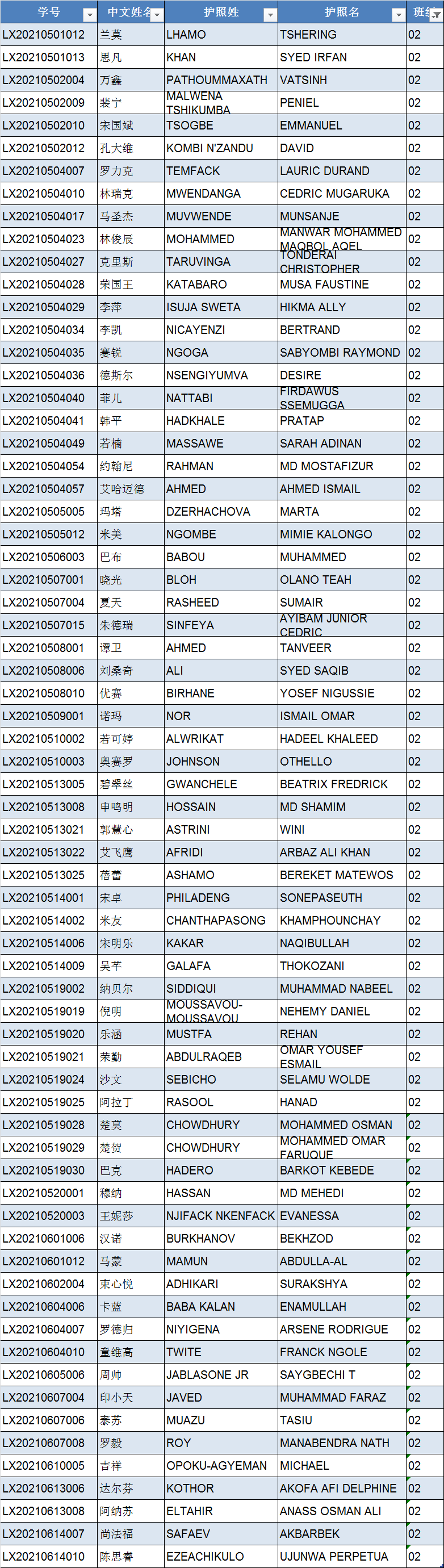 1) Class 01 refers to Chinese Language (2015LXS01-01) and Introduction to China (2015LXS03-01), including the doctoral students, senior scholars and general scholars of 2021.