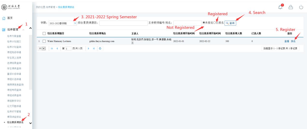 If you missed the deadline of registration for the Water Harmony Lectures in December, we release a few seats now. You may log in to the graduate system to register courses (see Annex for the specific operation procedure) before Feb. 21 and learn online from Feb. 28 to March 11.