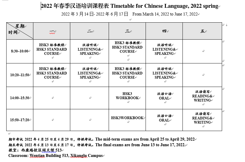 The HSK3 Courses in the spring semester of 2022 will start next Monday (From March 14th to June 17th ). Please see the name list as below and check the timetable and list of studying materials. All degree students need to prepare the studying materials by yourself. Please scan the QR code below to join the wechat group to receive the notice of course study later. You should also take the mid-term exams and final exams of the courses. If your attendance is under 80%, your seat will be cancelled.