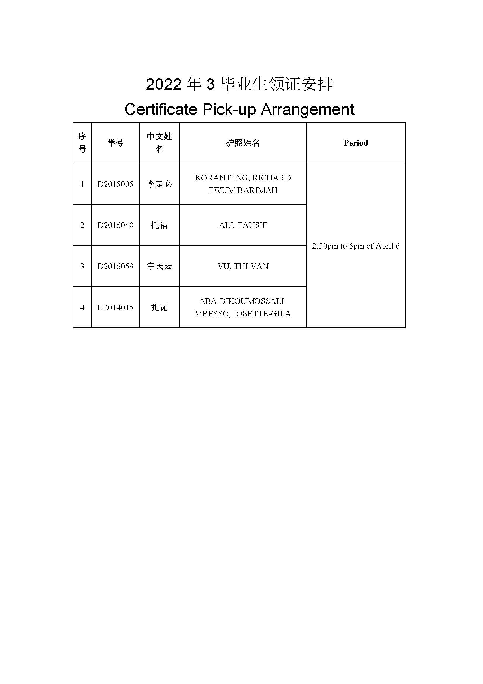 下列学生可于4月6日(周三)下午2点30至5点在西康路校区国际教育学院101办公室领取毕业相关证书。