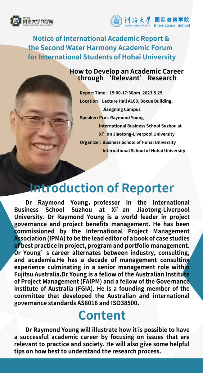 Introduction of reporterDr Raymond Youngprofessor in the International Business School Suzhou at Xi’an Jiaotong-Liverpool University. Dr Raymond Young is a world leader in project governance and project benefits management. He has been commissioned by the International Project Management Association (IPMA) to be the lead editor of a book of case studies of best practice in project, program and portfolio management. Dr Young’s career alternates between industry, consulting, and academia.He has a decade of management consulting experience culminating in a senior management role within Fujitsu Australia.Dr Young is a fellow of the Australian Institute of Project Management (FAIPM) and a fellow of the Governance Institute of Australia (FGIA). He is a founding member of the committee that developed the Australian and international governance standards AS8016 and ISO38500.