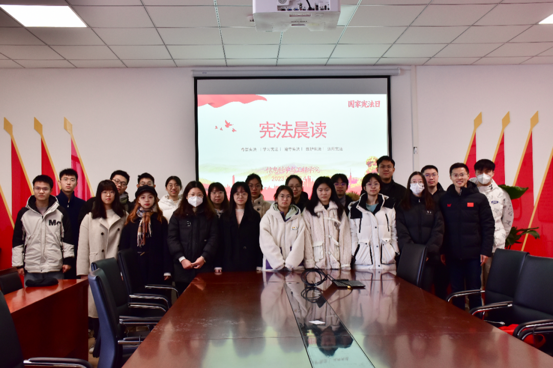 12月4日,学院组织本科生、研究生以及党支部代表在常州新校区20号楼403会议室参加教育部“宪法晨读”直播活动。活动中,同学们齐声朗读《中华人民共和国宪法》部分条款,表达了对宪法权威的拥护和对宪法精神的尊崇,感悟了宪法在新时代推进全面依法治国的国家根本法作用。活动结束后,同学们就活动感悟以及对于宪法的认识进行了分享与交流。