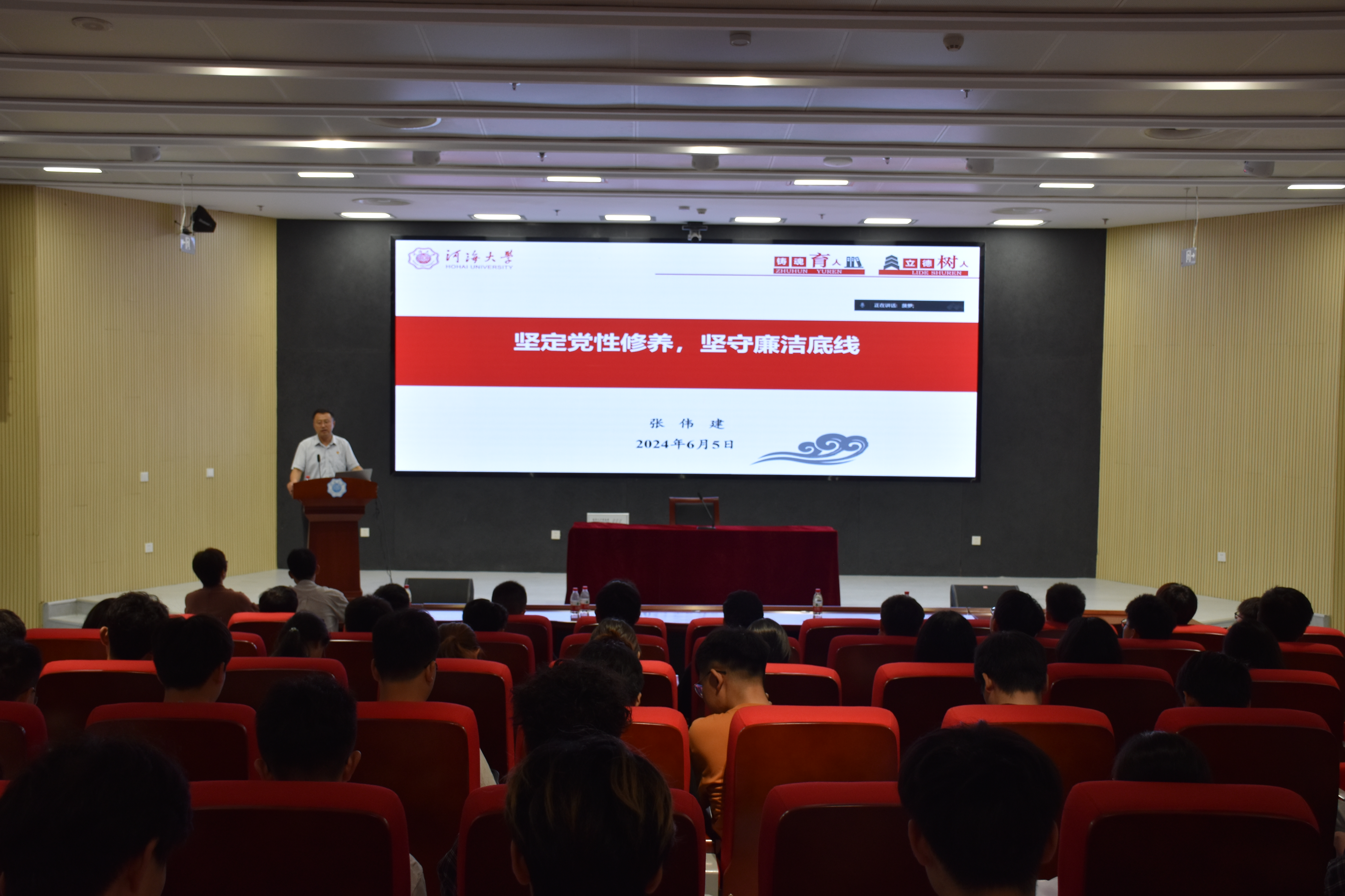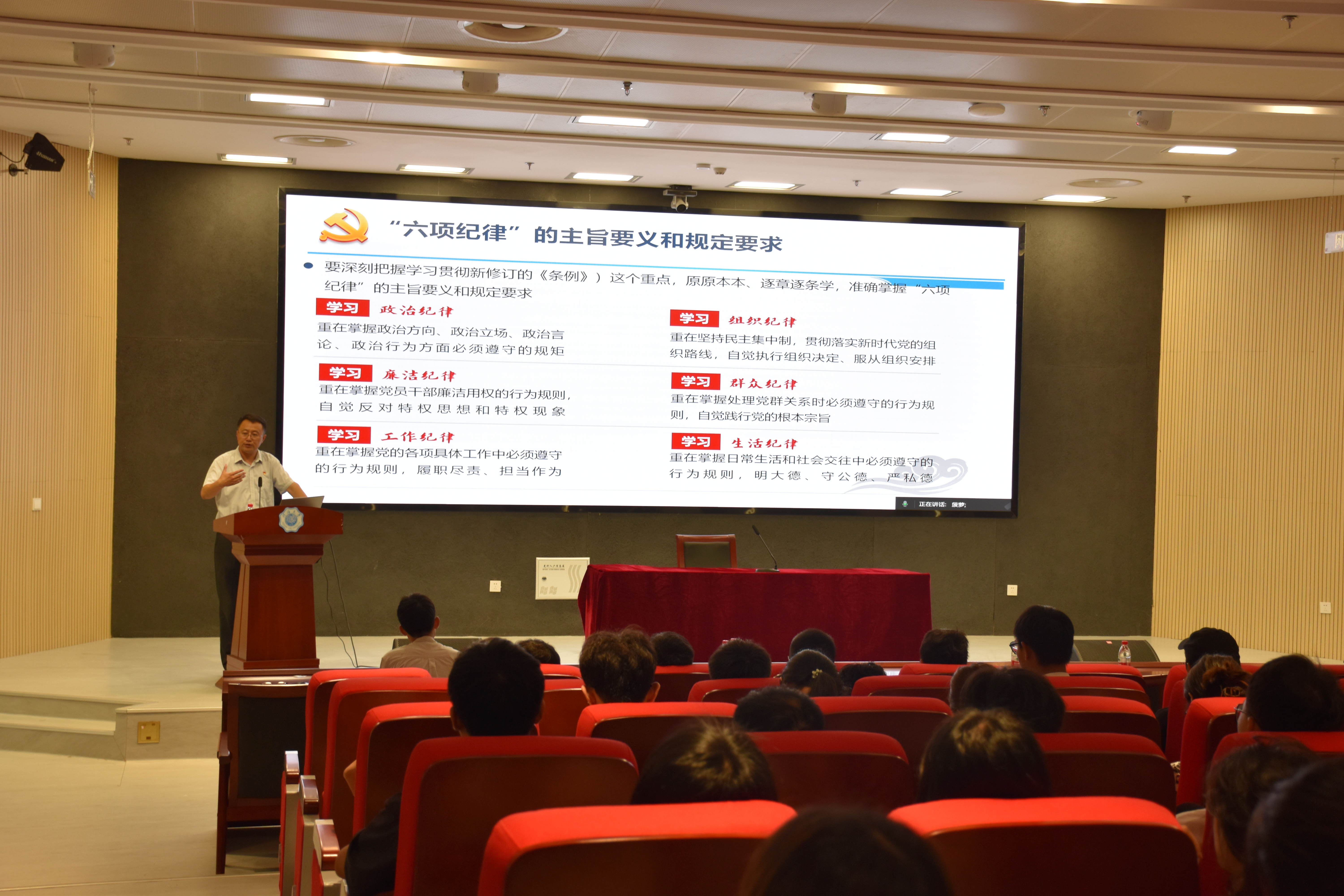 宣誓仪式上,学院全体预备党员、毕业班党员们列队整齐,握拳过肩,目光坚定,面向鲜红的党旗,再次庄严宣誓。在激昂的宣誓声中,每位党员都接受了一次深刻的思想洗礼,进一步强化了对党忠诚、全心全意为人民服务的担当使命。宣誓仪式结束后,张伟建书记讲授党课——《坚定党性修养,坚守廉洁底线》。专题党课从学习解读《中国共产党纪律处分条例》到防微杜渐坚守廉洁底线深入浅出地剖析,张伟建书记叮嘱全体党员要牢记党员身份,树立正确人生观和价值观,做人行事按照客观事实,讲求诚信。他寄语毕业生党员,要在工作学习中自觉发挥党员的先锋模范作用,用优异的成绩回报党组织的信任培养,让青春在为党和人民服务的事业中贡献力量。
