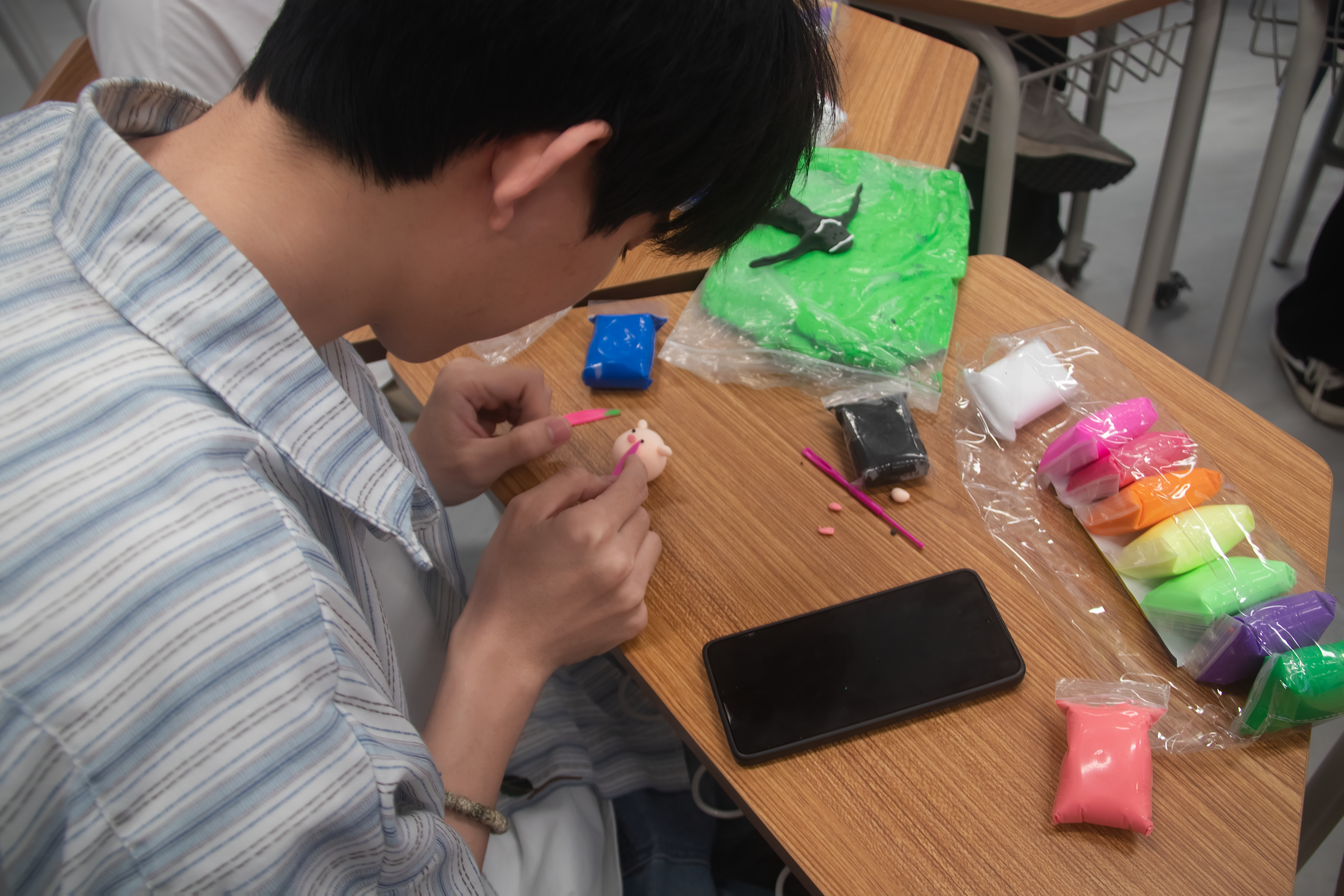 在精彩的开场之后,进入了本次活动的核心环节——粘土互动游戏与作品制作。同学们每人都拿到了一份彩色粘土和制作小工具,开启了奇妙的解压之旅。首先是粘土趣味传递游戏,大家挑选出自己最不喜欢颜色的粘土,把它搓成圆。在老师的口令下,小组间开始传递。在这个过程中,同学们尽情发挥创意,用各种方法对待手中的粘土:搓它、用小工具拍打它、捏它……仿佛那些压力随着对粘土的 “摆弄”,一点点地被释放出来。压力释放后,大家静下心来,开始制作“我心中的情绪小怪兽”。同学们充分发挥想象力,将各种颜色的粘土巧妙组合,用细腻的手指塑造出一只只独特的 “情绪小怪兽”,有人捏出“可爱的叮当猫”,有人捏出“搞怪的小白蛇”。通过创作,大家将平日里压抑的情绪以一种艺术的方式展现出来,实现了与自己内心的深度对话。