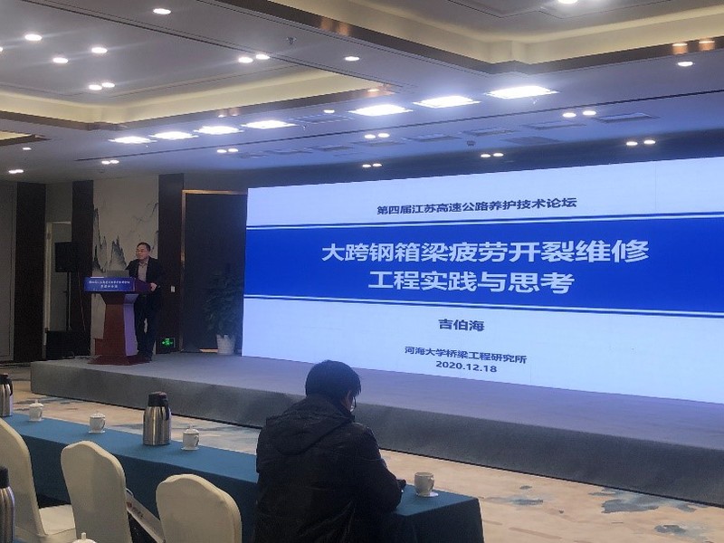 2020年12月18日,“第四届江苏高速公路养护技术论坛”在南京隆重召开,课题组吉伯海老师、袁周致远老师、博士生姚悦、高天参加了会议。会上吉伯海老师受邀作了题为“大跨钢箱梁疲劳开裂维修工程实践与思考”的大会报告。