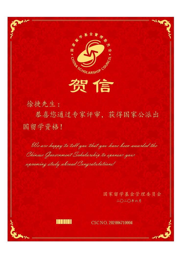 课题组硕士生徐捷获得国家公派出国留学资格